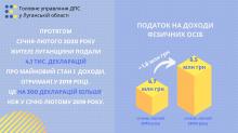 В Головному управлінні ДПС у Луганській області повідомили, що протягом січня-лютого поточного року жителі Луганщини подали 4,1 тис. декларацій про майновий стан і доходи, отримані у 2019 році. Це на 300 декларацій більше, ніж за аналогічний період минулого року.