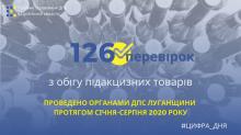 Протягом січня - серпня 2020 року працівниками Головного управління ДПС у Луганській області проведено 126 перевірок суб’єктів господарювання з питань дотримання діючого законодавства щодо регулювання виробництва і обігу спирту етилового, коньячного і плодового, алкогольних напоїв, тютюнових виробів та пального.