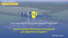 В Головному управлінні ДПС у Луганській області повідомили, що у січні - листопаді 2020 року до Зведеного бюджету України надійшло 143,1 млн грн рентної плати за користування надрами.