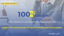 На розрахункові рахунки в банку платникам повернуто понад 100 млн грн ПДВ, заявленого до бюджетного відшкодування