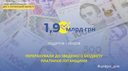 До зведеного бюджету платники Луганщини перерахували майже 1,9 млрд грн податків і зборів