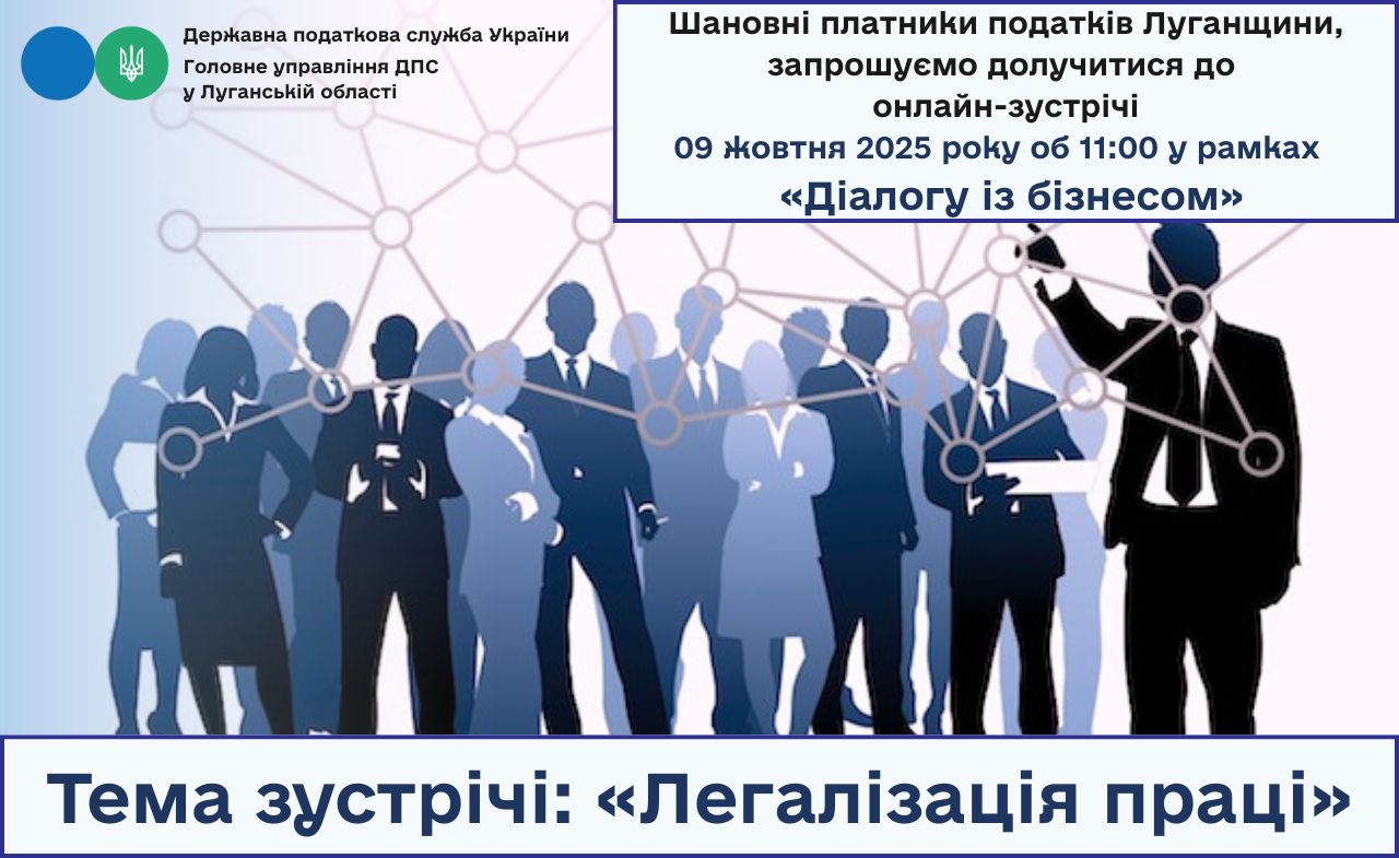09 жовтня об 11:00, у рамках проєкту «Діалог з бізнесом», відбудеться онлайн-зустріч з підприємцями Луганщини за темою: «Легалізація праці».