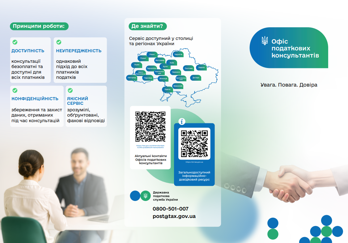 Державна податкова служба України забезпечує платникам податків якісну інформаційно-консультаційну підтримку з широкого кола питань. Кожен громадянин та представник бізнесу може отримати професійні консультації від податкових фахівців.
