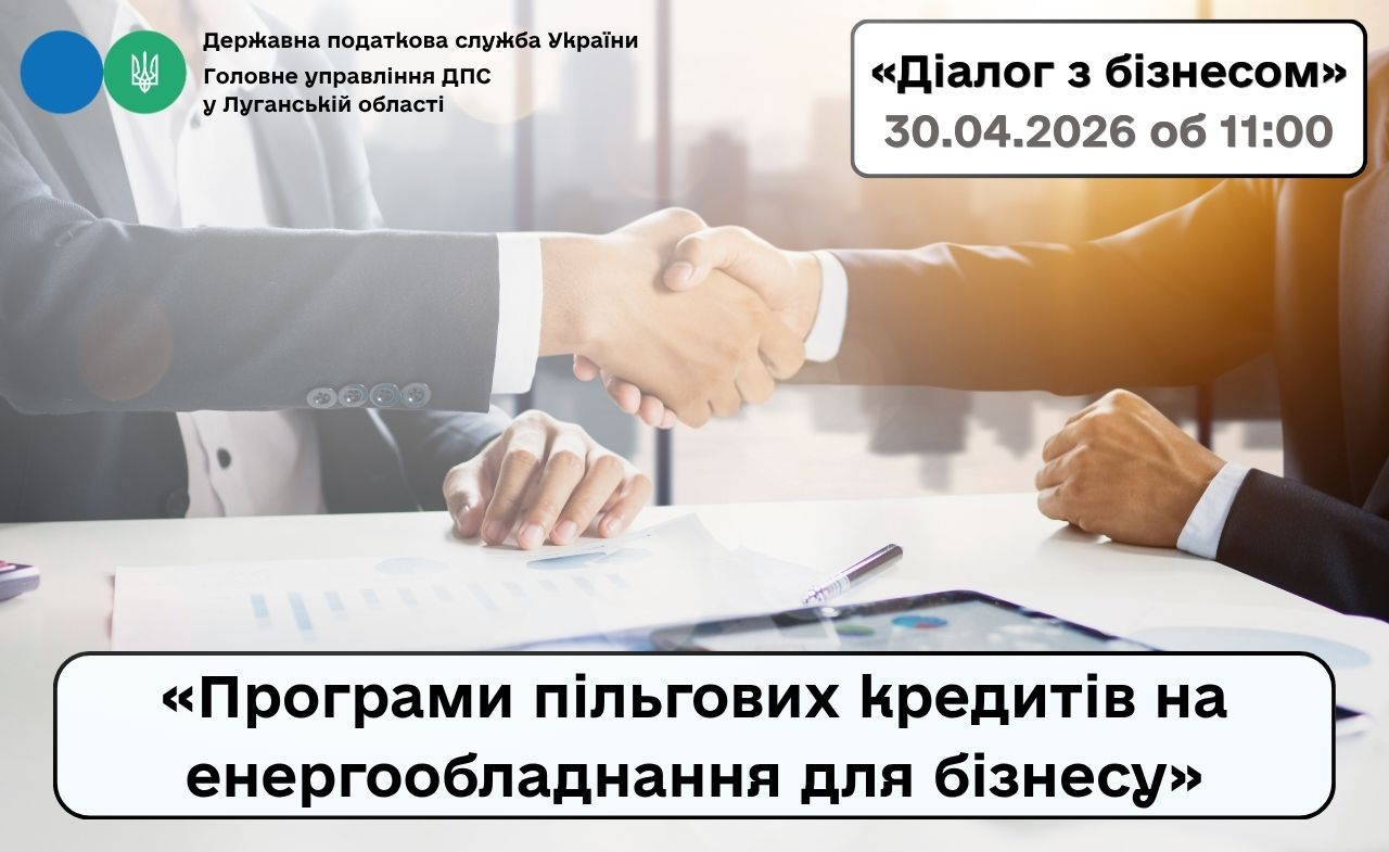 30 квітня 2026 року об 11:00, у рамках проєкту «Діалог з бізнесом», відбудеться онлайн-зустріч за темою: «Програми пільгових кредитів на енергообладнання для бізнесу».
