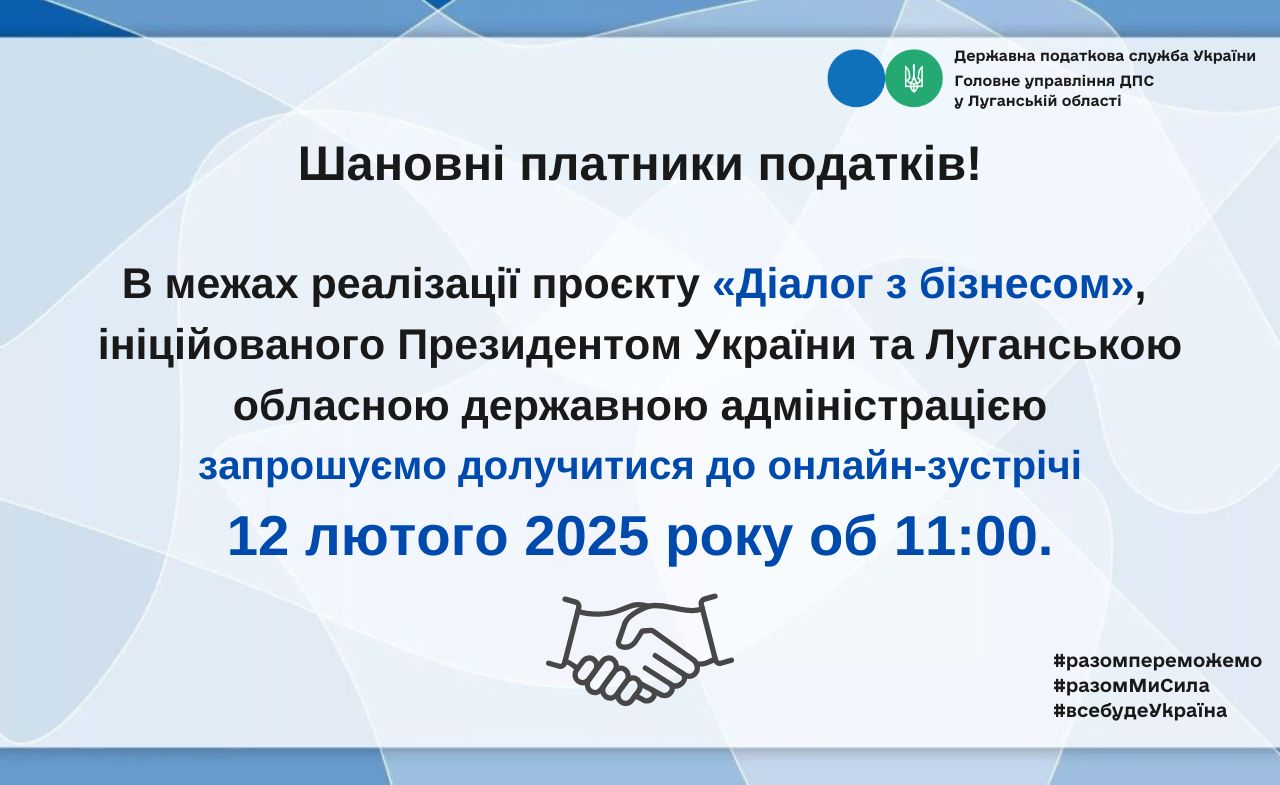 В межах реалізації проєкту «Діалог з бізнесом», ініційованого Президентом України Володимиром Зеленським та Луганською обласною державною адміністрацією, пропонуємо долучитися до онлайн-зустрічі, яка відбудеться 12 лютого 2025 року об 11:00.