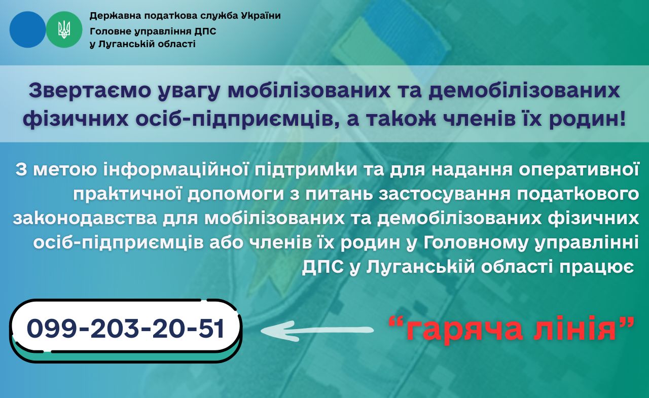 Головне управління ДПС у Луганській області нагадує, що створена робоча група та «гаряча лінія» для надання консультацій мобілізованим ФОП – платникам податків