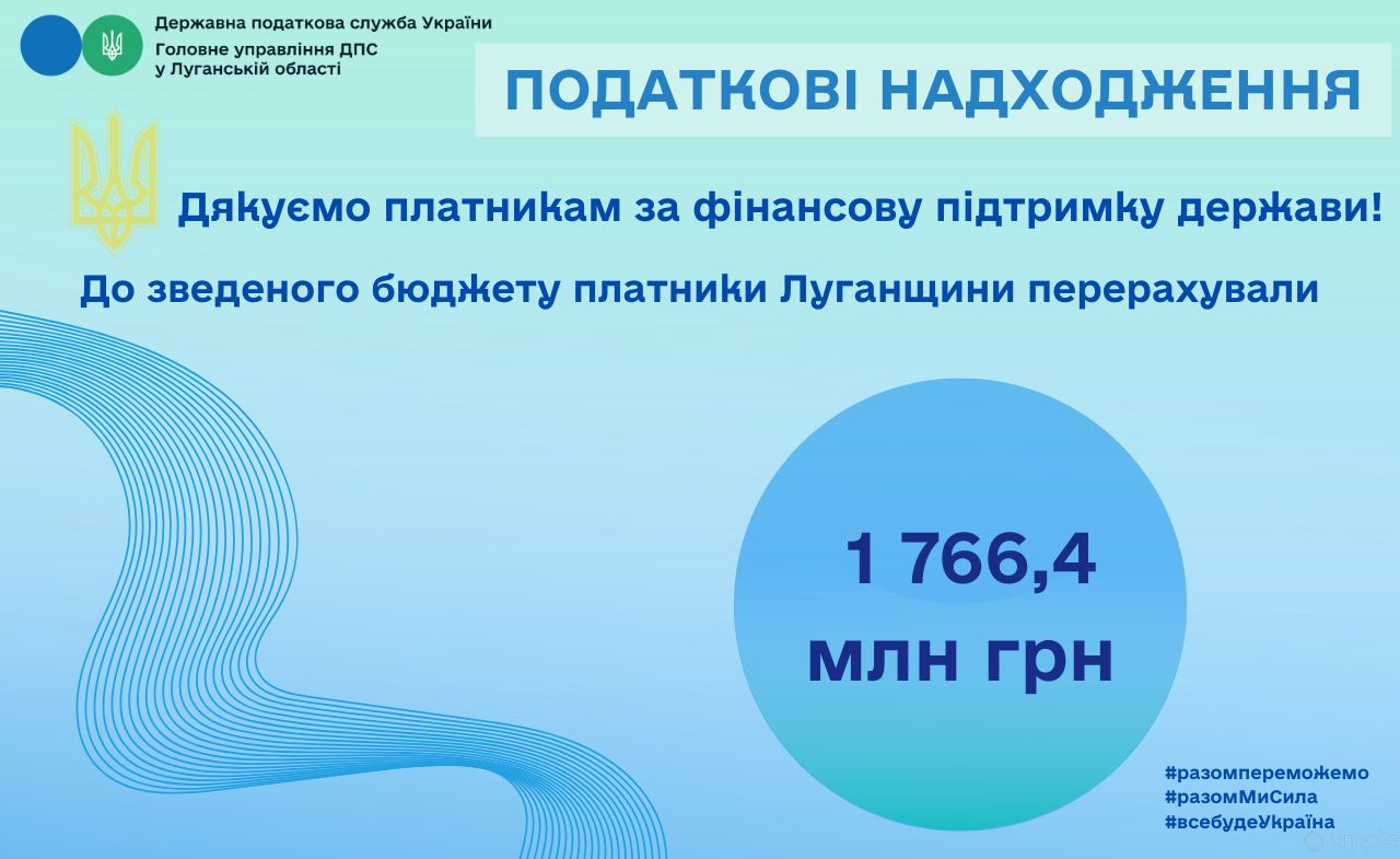 Дякуємо платникам за фінансову підтримку держави! До зведеного бюджету платники Луганщини перерахували 1 766,4 млн грн податків і зборів