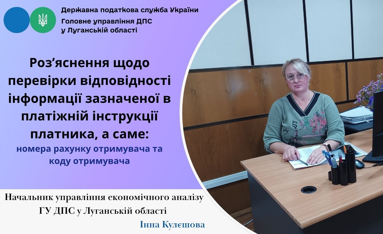 Начальник управління економічного аналізу Головного управління ДПС у Луганській області Інна Кулєшова інформує, що відповідно до вимог підпункту 1 пункту 22 та пункту 23 розділу І Інструкції про безготівкові розрахунки в національній валюті користувачів платіжних послуг, затвердженою постановою Правління Національного банку України від 29.07.2022 №163 (далі – Інструкція №163), при зарахуванні коштів на рахунок отримувача коштів  надавачем платіжних послуг здійснюється перевірка відповідності інформації зазначеної в платіжній інструкції платника, а саме: номера рахунку отримувача та коду отримувача.