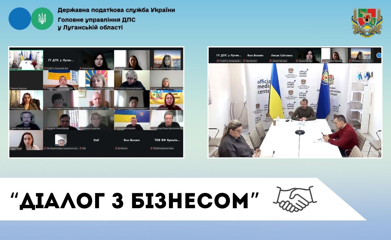 У рамках проєкту «Діалог з бізнесом», на платформі облдержадміністрації Луганщини, відбулася онлайн-зустріч з підприємцями та громадськістю області, до якої приєдналась й очільниця Головного управління ДПС у Луганській області Людмила Хворостян.