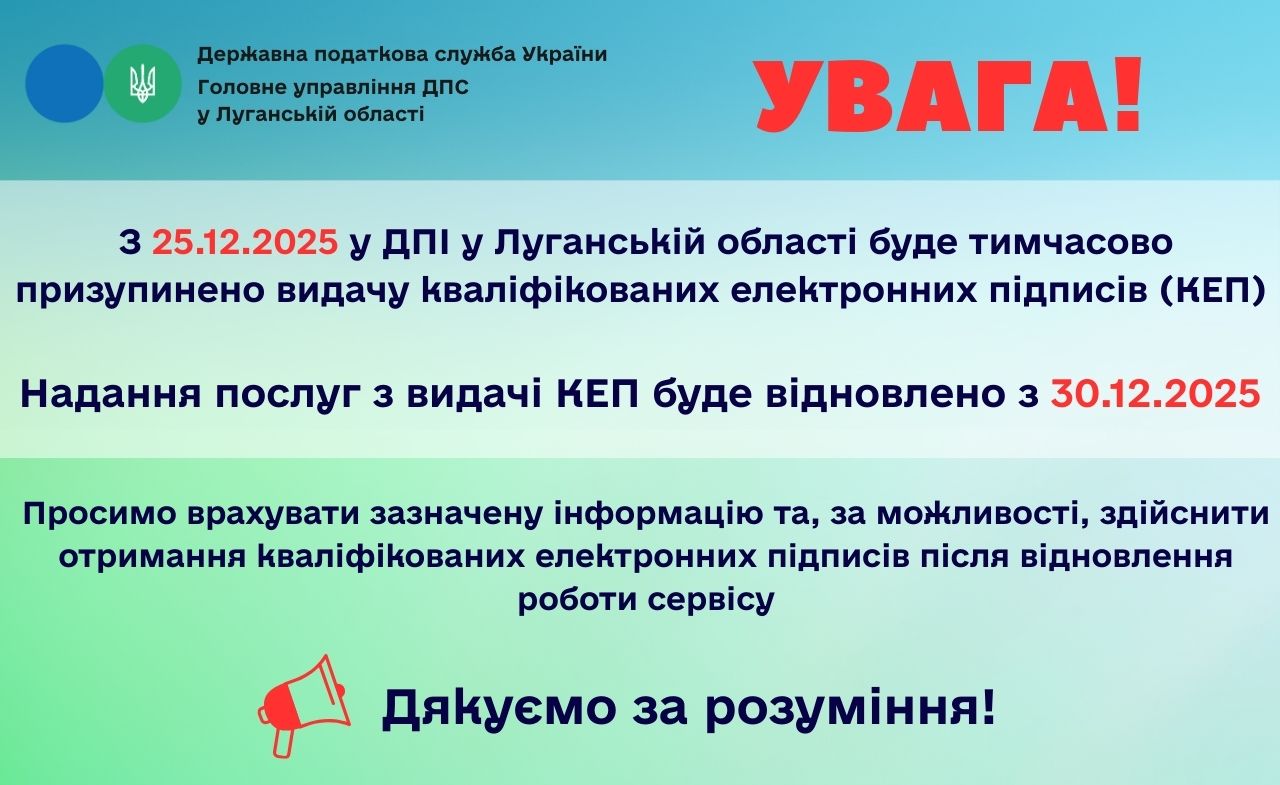- До уваги громадян! З 25.12.2025 у ДПІ у Луганській області тимчасово призупинено видачу кваліфікованих електронних підписів