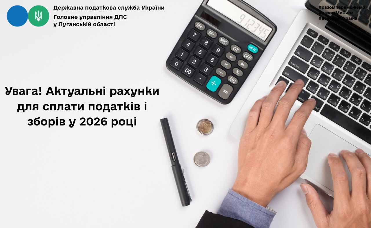 Головне управління ДПС у Луганській області інформує платників податків, що на субсайті у розділі «Рахунки для сплати платежів» за посиланням: https://lg.tax.gov.ua/rahunki-dlya-splati-platejiv розміщені реквізити рахунків для обліку доходів до державного та місцевих бюджетів у 2026 році, які відкриваються згідно з наказом Державної казначейської служби України від 25.12.2025 № 365 «Про затвердження Змін до Довідника відповідності символу звітності коду класифікації доходів бюджету».