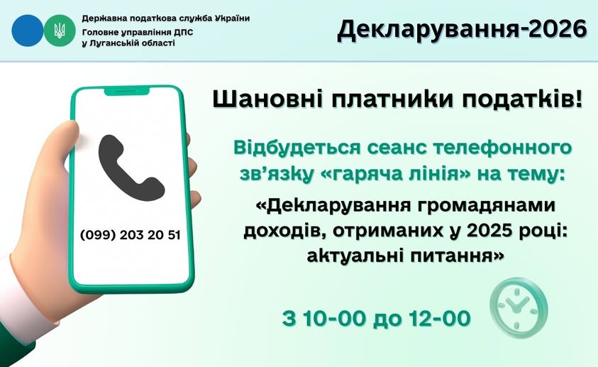 16 січня 2026 року з 10-00 до 12-00 відбудеться сеанс телефонного зв’язку «гаряча лінія» на тему: «Декларування громадянами доходів, отриманих у 2025 році: актуальні питання».