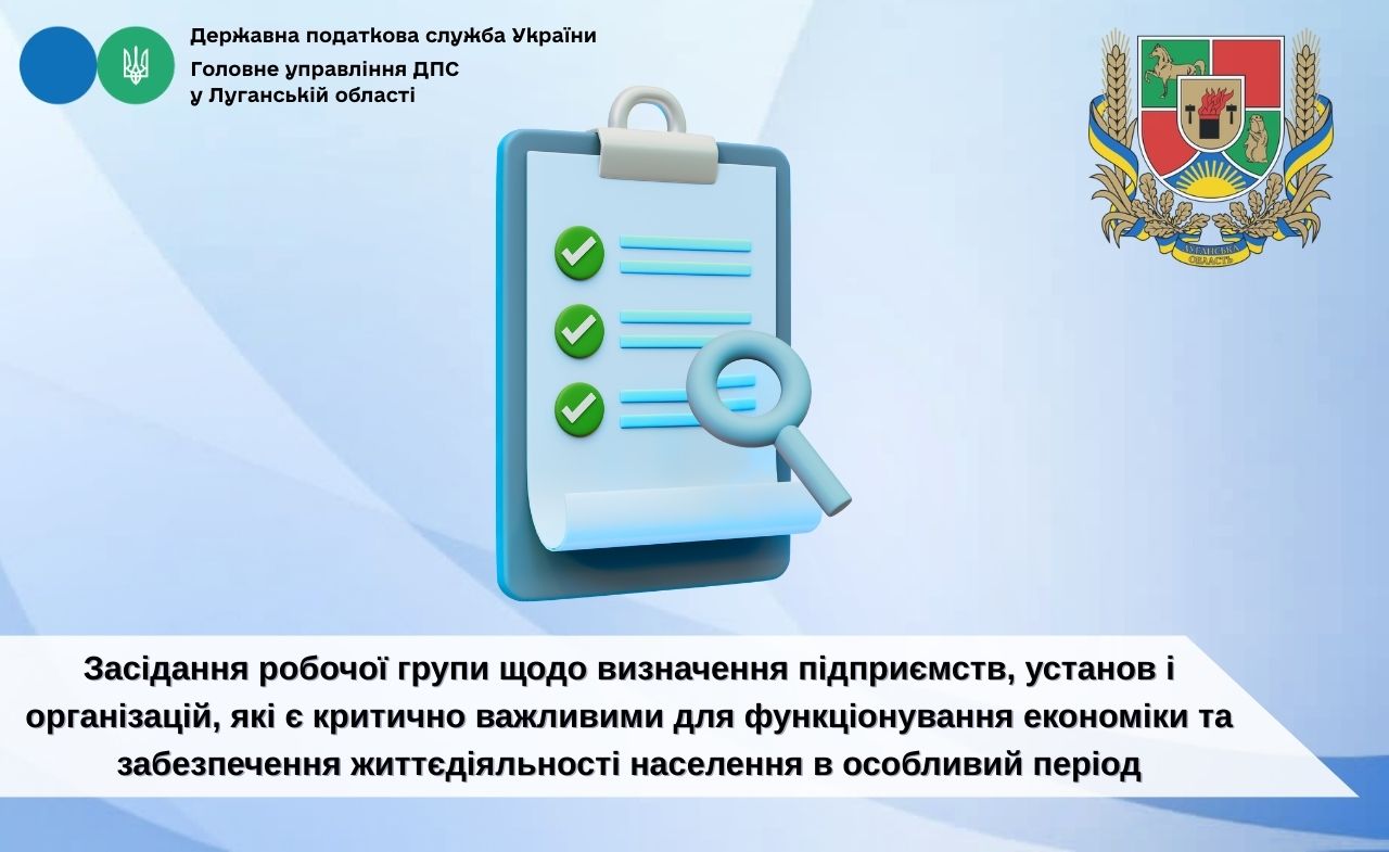 Під головуванням першого заступника голови Луганської обласної державної адміністрації Олексія Смирнова та за участі керівниці Головного управління ДПС у Луганській області Людмили Хворостян відбулося чергове онлайн-засідання робочої групи з питань визначення підприємств, установ і організацій, які є критично важливими для функціонування економіки та забезпечення життєдіяльності населення в особливий період.