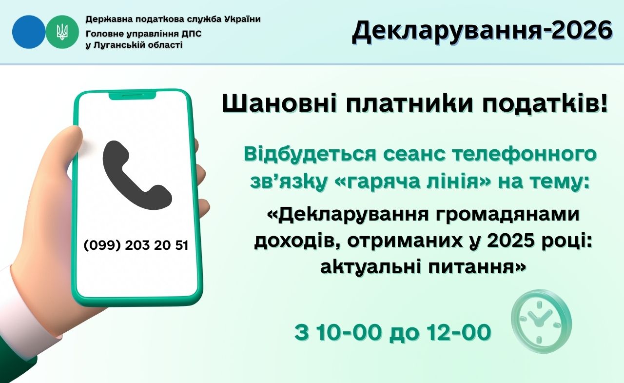 Шановні платники податків! 19 лютого 2026 року з 10-00 до 12-00 відбудеться сеанс телефонного зв’язку «гаряча лінія» на тему: «Декларування громадянами доходів, отриманих у 2025 році: актуальні питання»