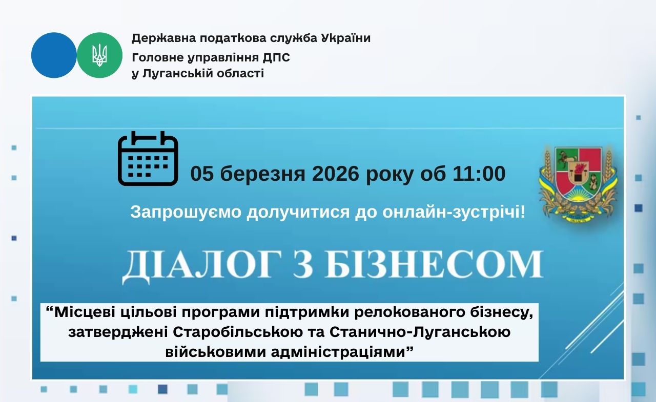 05 березня об 11:00, у рамках проєкту «Діалог з бізнесом», відбудеться онлайн-зустріч з підприємцями Луганщини за темою: «Місцеві цільові програми підтримки релокованого бізнесу, затверджені Старобільською та Станично-Луганською військовими адміністраціями».
