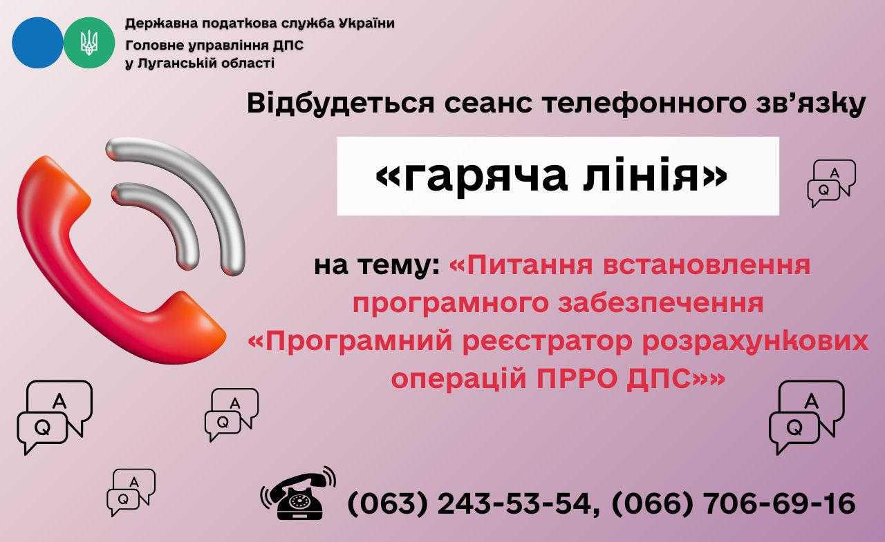 Шановні платники податків! 24 березня 2026 року з 10-00 до 12-00 відбудеться сеанс телефонного зв’язку «гаряча лінія» на тему: «Питання встановлення програмного забезпечення «Програмний реєстратор розрахункових операцій ПРРО ДПС»»