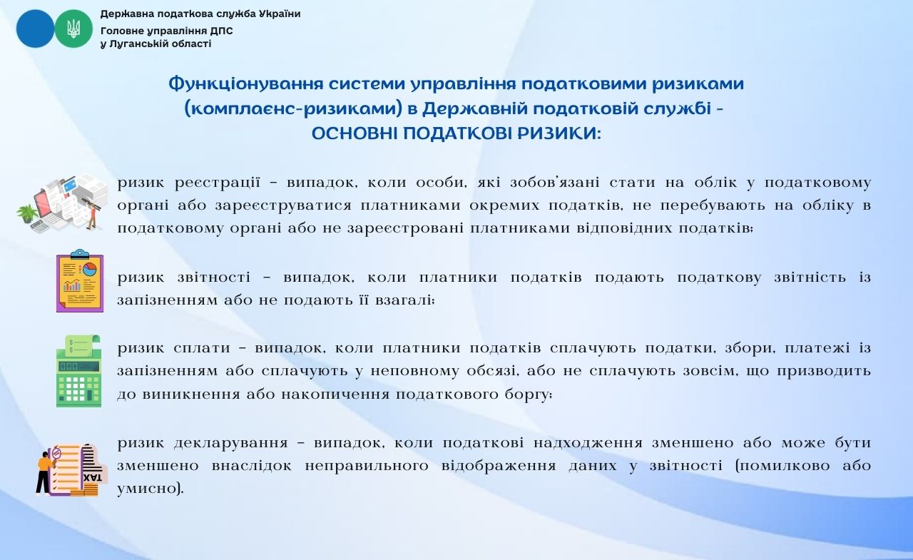 Головне управління ДПС у Луганській області нагадує платникам податків про реалізацію експериментального проєкту щодо функціонування системи управління податковими ризиками (комплаєнс-ризиками). Цей проект є однією з важливих складових реформування податкової системи України у межах Національної стратегії доходів.